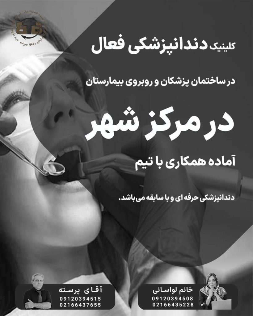 کلینیک دندانپزشکی فعال در ساختمان پزشکان و روبروی بیمارستان در مرکز شهر آماده همکاری با تیم دندانپزشکی حرفه ای و با سابقه میباشد. برای اطلاعات بیشتر از تماس بگیرید.